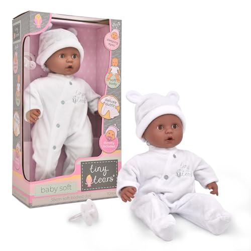 John Adams Tiny Tears Baby Soft Doll 15" (38 cm) - Black/Dark Skin | Soft Bodied Baby with Closing Eyes & Dummy | Deluxe White Outfit | Cuddly First Doll Set | Toy for Toddlers Age 10 Months+