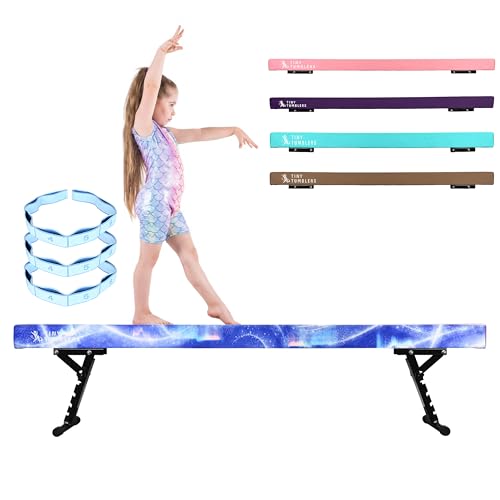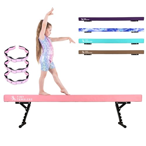 TINY TUMBLERS Gymnastics Beam For Kids - Advanced Adjustable Gymnastics Equipment For Children at Home - High and Low Beam - Faux Suede, Five Height Levels - Flexibility Strap Included