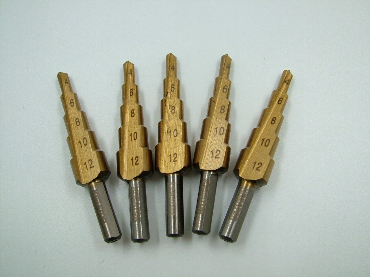 HSS Titan step drill Pack x5 4-12mm titanium nitride Kreator brand 4/6/8/10/12mm