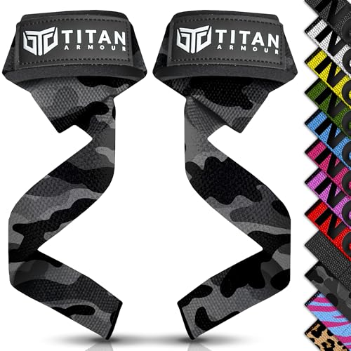 Titan Armour® Weight Lifting Straps | Extra-Long Neoprene Padded Heavy-Duty Weightlifting Straps | Deadlifts | Anti-Slip Gel Option | Gym Accessories Men & Women (Camo, Grey (No Gel))