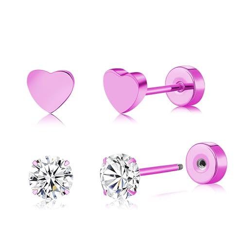 FACOKO 2 Pairs Women Earrings Nickel Free Titanium Flat Back Earring Pink Heart Earrings Stud CZ Cartilage Stud Hypoallergenic Screw Back Earring(5mm-Pink-Heart&CZ Flat Back)