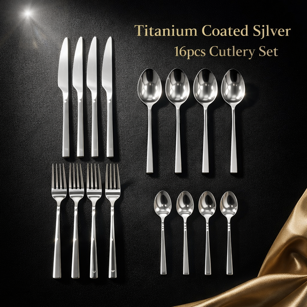 Cutlery Sets Spoon Fork Dinner 16 Pcs Titanium-coated silver cutlery set UK