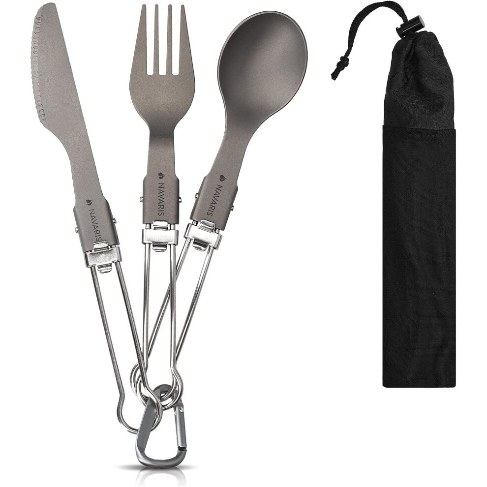 Navaris Titanium Camping Cutlery Set - Lightweight Foldable Metal Silverware for Backpacking, Hiking - Knife, Fork and Spoon with Carabiner and Bag