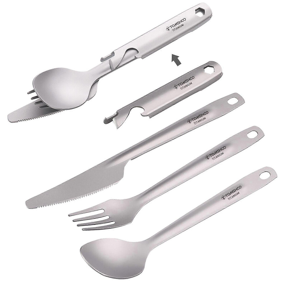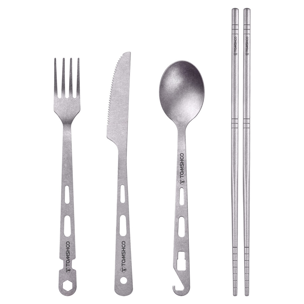 (As show, One size) TOMSHOO 4-in-1 Titanium Flatware Cutlery Set Lightweight Dinner Spoon Fork Cutter with Multifunctional Storage Holder Bottle Opene