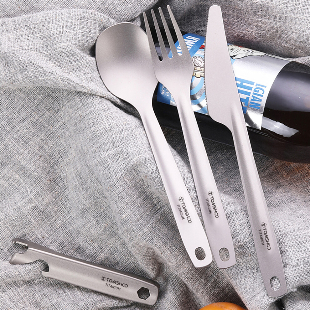 TOMSHOO 4-in-1 Titanium Flatware Cutlery Set Lightweight Dinner Spoon Fork Cutter with Multifunctional Storage Holder Bottle Opener for Cam