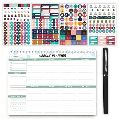 Weekly Planner, 53 Page To Do List Notebook, Daily Planner with 4 Sheets of Stickers and 1 Black Pen, Organiser Notebook for Work School Home Personal Organized