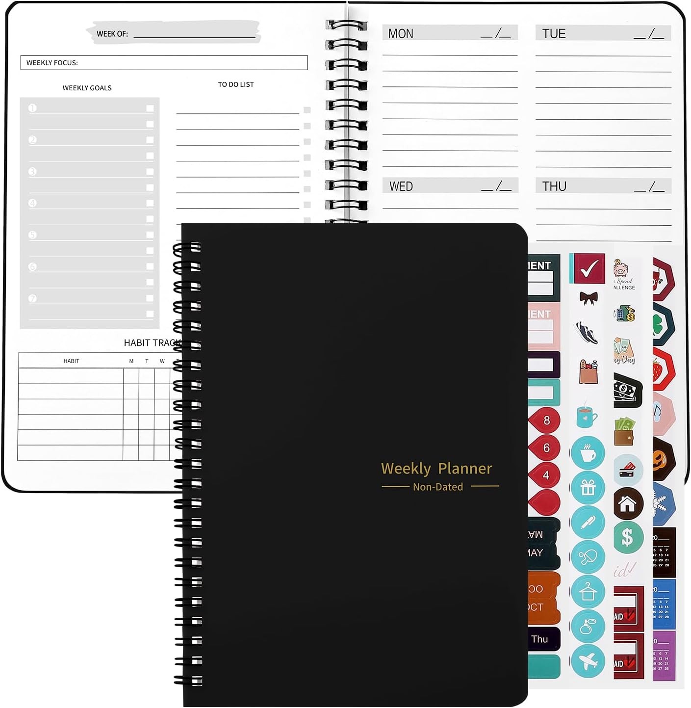 Undated Weekly Planner, A5 To Do List Notebook 53 Weeks Planning Hardcover Weekly Goals Planner with 24 Self-Adhesive Monthly Tabs for Daily life, Work, College