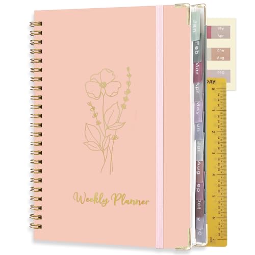 Undated Weekly Planner, A5 To Do List Notebook 53 Weeks Planning Hardcover Weekly Goals Planner with 24 Self-Adhesive Monthly Tabs for Daily life, Work, College (Pink)
