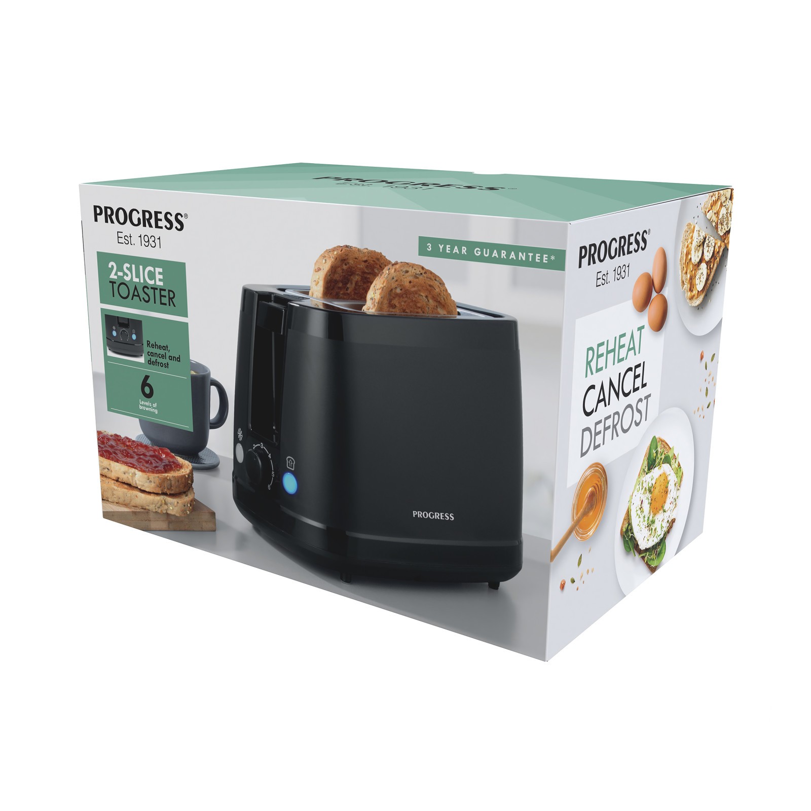 Progress Kettle & Toaster Set – 2-Slice Toaster with 6 Browning Levels and Defrost, Reheat, & Cancel Functions, 1.7 Litre Rapid Boil Kettle with Safety Features and Removable Limescale Filter, Black