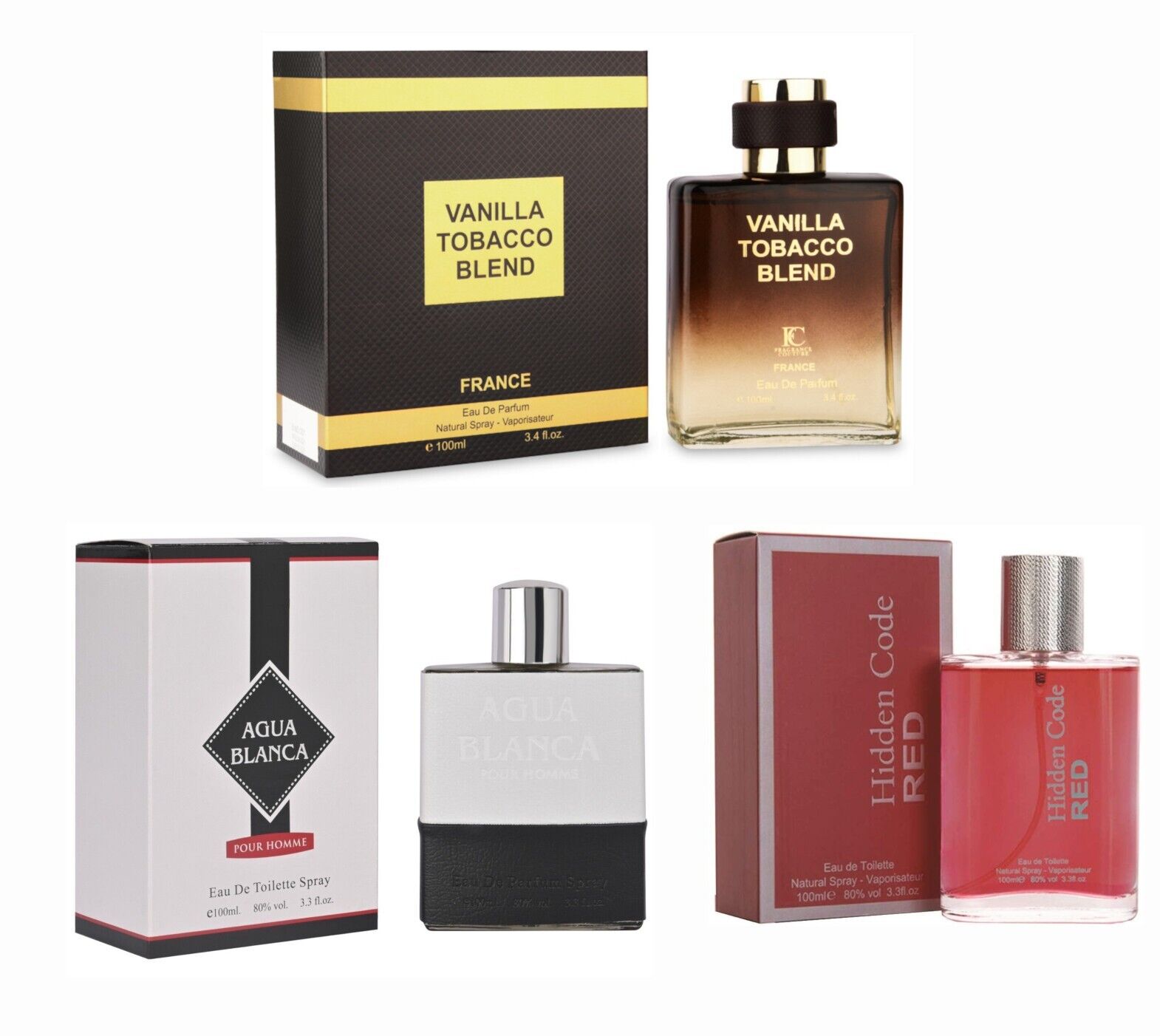 3 Pack ~ Men's Perfume Agua Blanca, Vanilla Tobacco, Hidden Code Red EDP 100ml