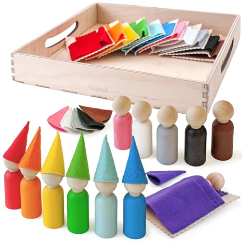 Ulanik Small Peg Dolls with Hats and Beds Toddler Montessori Toys for 3+ Year Olds Baby Waldorf Dolls Wooden Games for Colour Sorting and Counting — 12 Gnomes