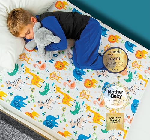 Bedwetz Potty Training Bed Pads | 100% Waterproof Mattress Protector | Bedwetting Sheets, size fits Single & Toddler Beds | Non Slip Mat with Side Wing Tucks | UK Brand | Animal