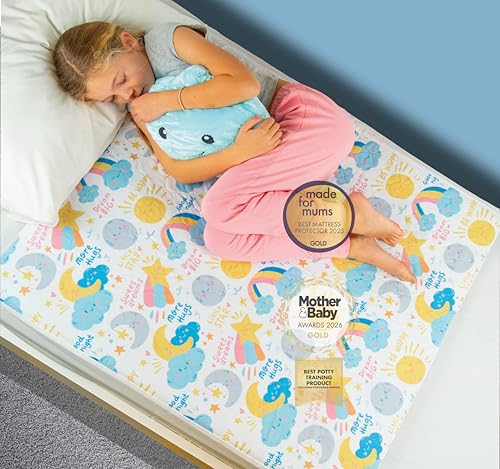 Bedwetz Potty Training Bed Pads | 100% Waterproof Mattress Protector | Bedwetting Sheets, size fits Single & Toddler Beds | Non Slip Mat with Side Wing Tucks | UK Brand | Moon