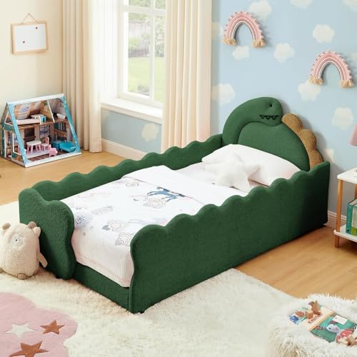 PsaltryCom Kids Upholstered Bed Frame with Dinosaur Design, Low Floor Toddler Bed with Soft Headboard, Cute Children Bed for Boys Girls Bedroom (green)