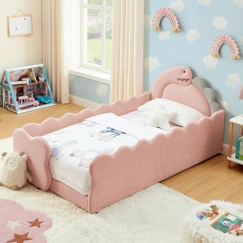 PsaltryCom Kids Upholstered Bed Frame with Dinosaur Design, Low Floor Toddler Bed with Soft Headboard, Cute Children Bed for Boys Girls Bedroom (pink)