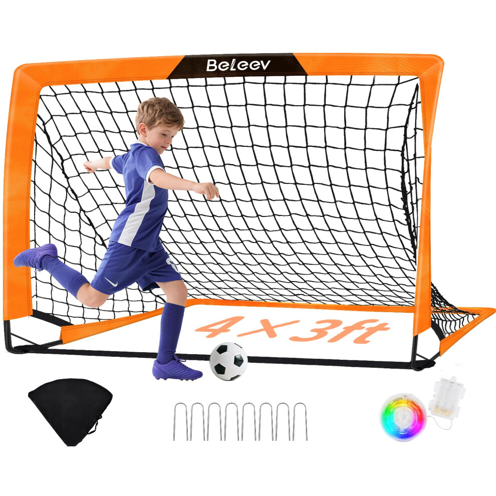 BELEEV 4x3 ft Kids Football Goal for Garden, Portable Toddler Pop Up Goals with LED Lights, Carry Bag, FootballGoal Net for Kid Youth Indoor Outdoor Training Game Practice Sport