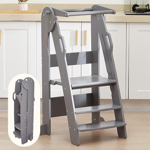 AIYAPLAY Kids Step Stool, Foldable Toddler Kitchen Stool, Adjustable Standing Tower with Handle, Non-Slip for Bathroom, Sink, Kitchen, Counter, Toilet Potty Training, Grey