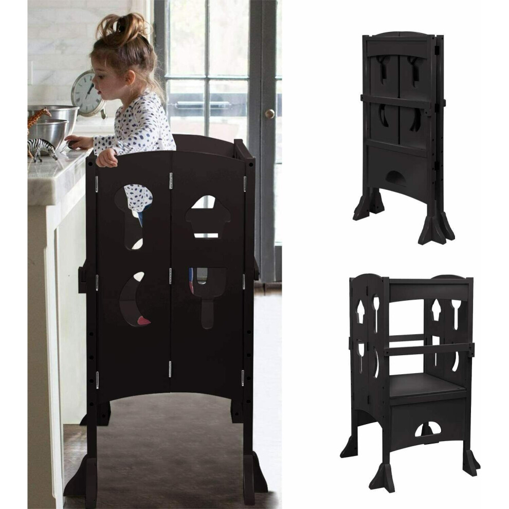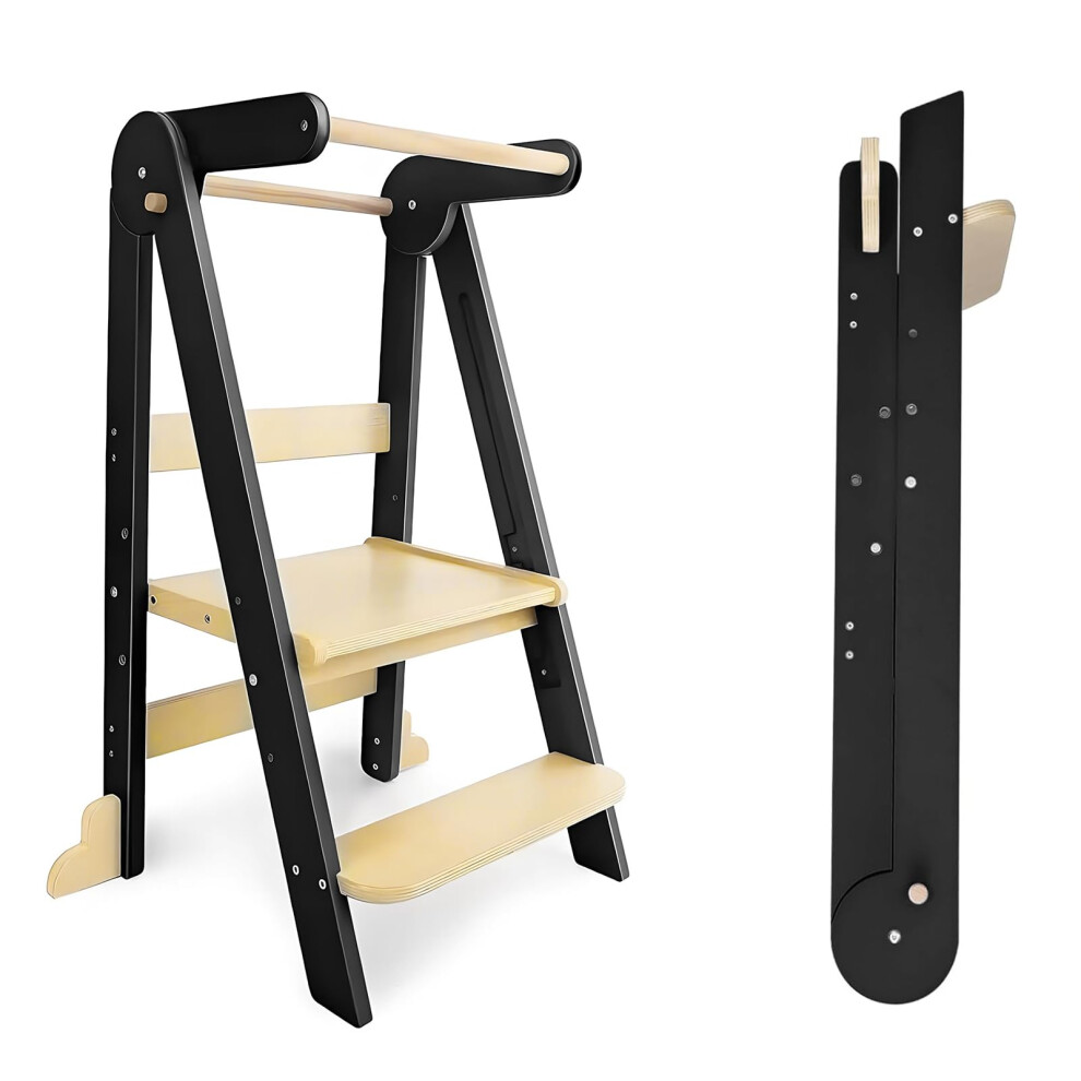 Foldable Wooden Learning Tower with Adjustable Heights, Montessori Toddler Kitchen Stool Helper Black