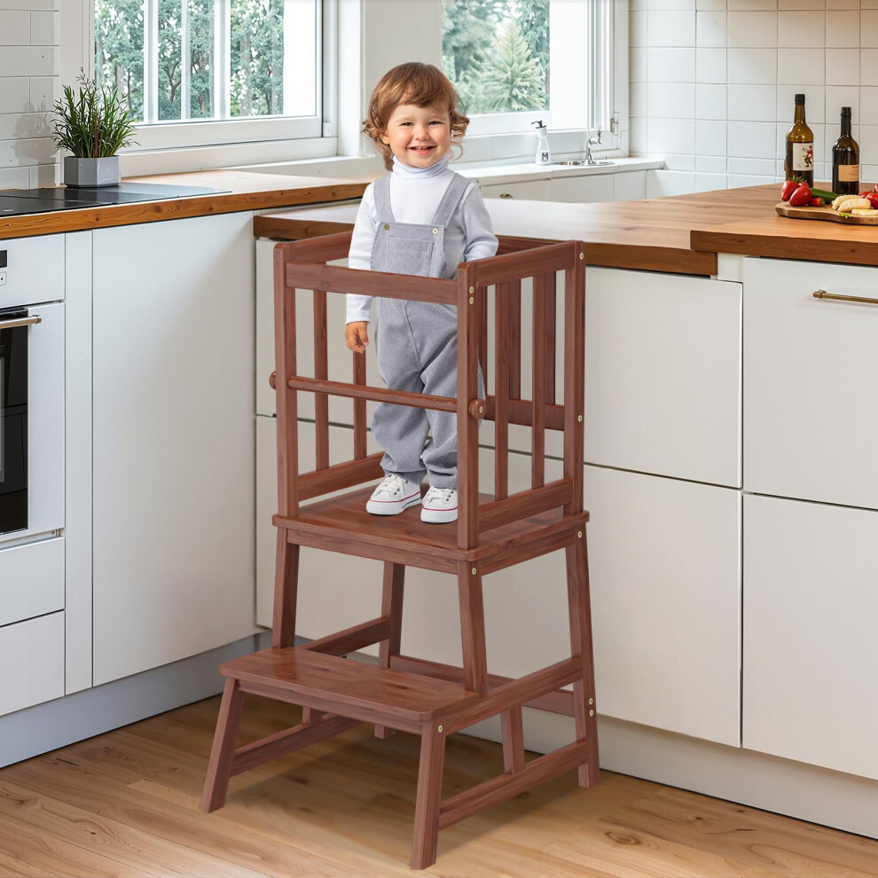 Toddler Kitchen Helper Stool with Safety Rail, Wooden Kids Step Tower for Cooking and Learning, Brown