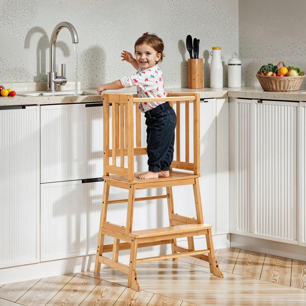 Montessori Toddler Tower Kitchen Wooden Helper Step Stool with Adjustable Steps and Safety Rail