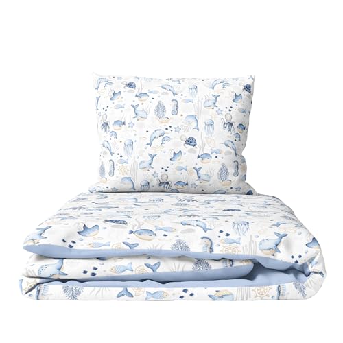 Baby Comfort 2-Piece Toddler Duvet & Pillow Set - 120x90 cm - 100% Cotton Breathable Fabric - Machine Washable Quilted Bedding for Cot Bed 12M+ (Ocean)