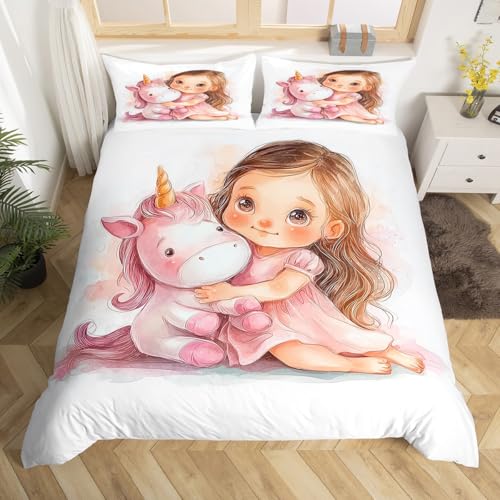 Homewish Cute Girl King Duvet Cover Set Unicorn Toddler Bedding Set for Kids Girls Teens, Pink and White Quilt Cover Cartoon Animal Bed Sets with 2 Pillowcases, Sweet Princess Bedroom Decor