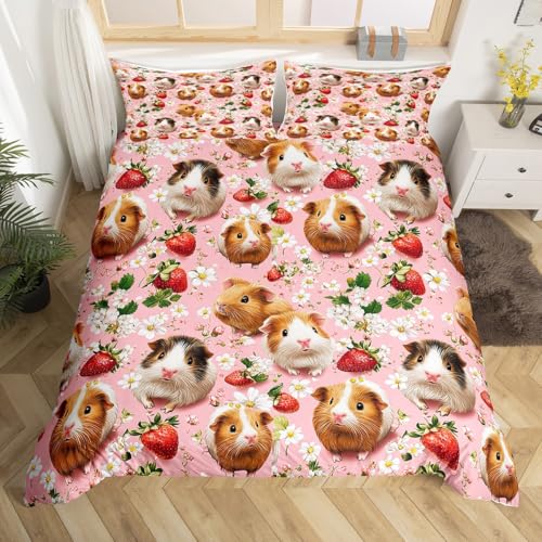Homewish Guinea Pig Double Duvet Cover for Kids Girls Teens, Cute Guinea Pig Themed Toddler Bedding Set Lovely Pet Animal Quilt Cover Cartoon Strawberry Pattern Bed Sets, Pink Reversible
