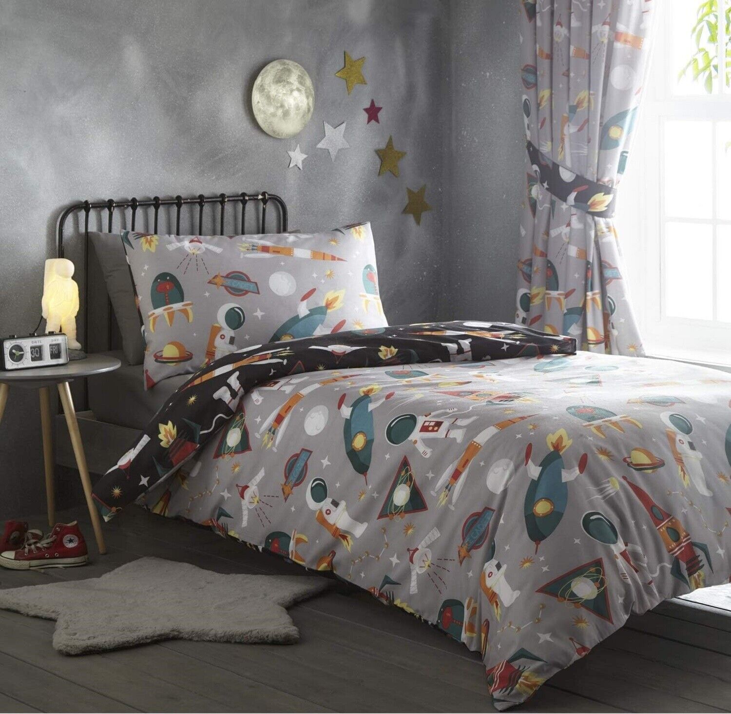 Duvet Cover Pillowcase Set Spaceman Toddler Bed Kids Club Polycotton Quilt Grey