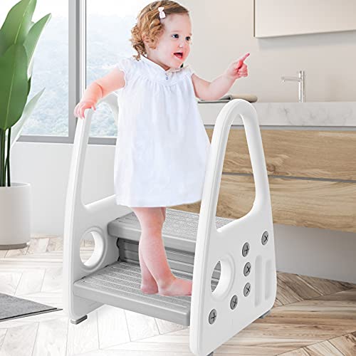 Cryfokt 2 Step Stool for Kids Safe Widened Base Antiskid Bathroom Toddler Step Stool 14.0 X 12.8 X 9.4in Adjustable Height for Children PP Material (Grey White)