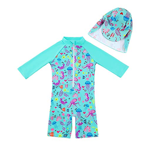 Toddler Baby Girls Swimsuit, Long Sleeve Sun Protection Swimsuit with Hat, Zipper Baby Wetsuit for Swimming