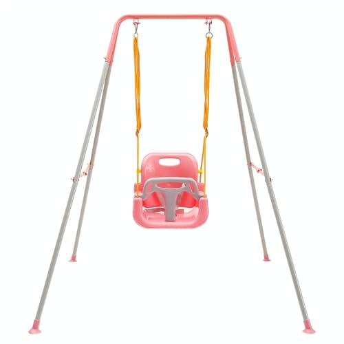 FUNLIO Toddler Swing with 4 Sandbags, Heavy-Duty Kid Swing with Safety Harness for Garden, Indoor Swing for Baby with Folding Metal Stand, Outdoor Play Equipment for Children - Pink