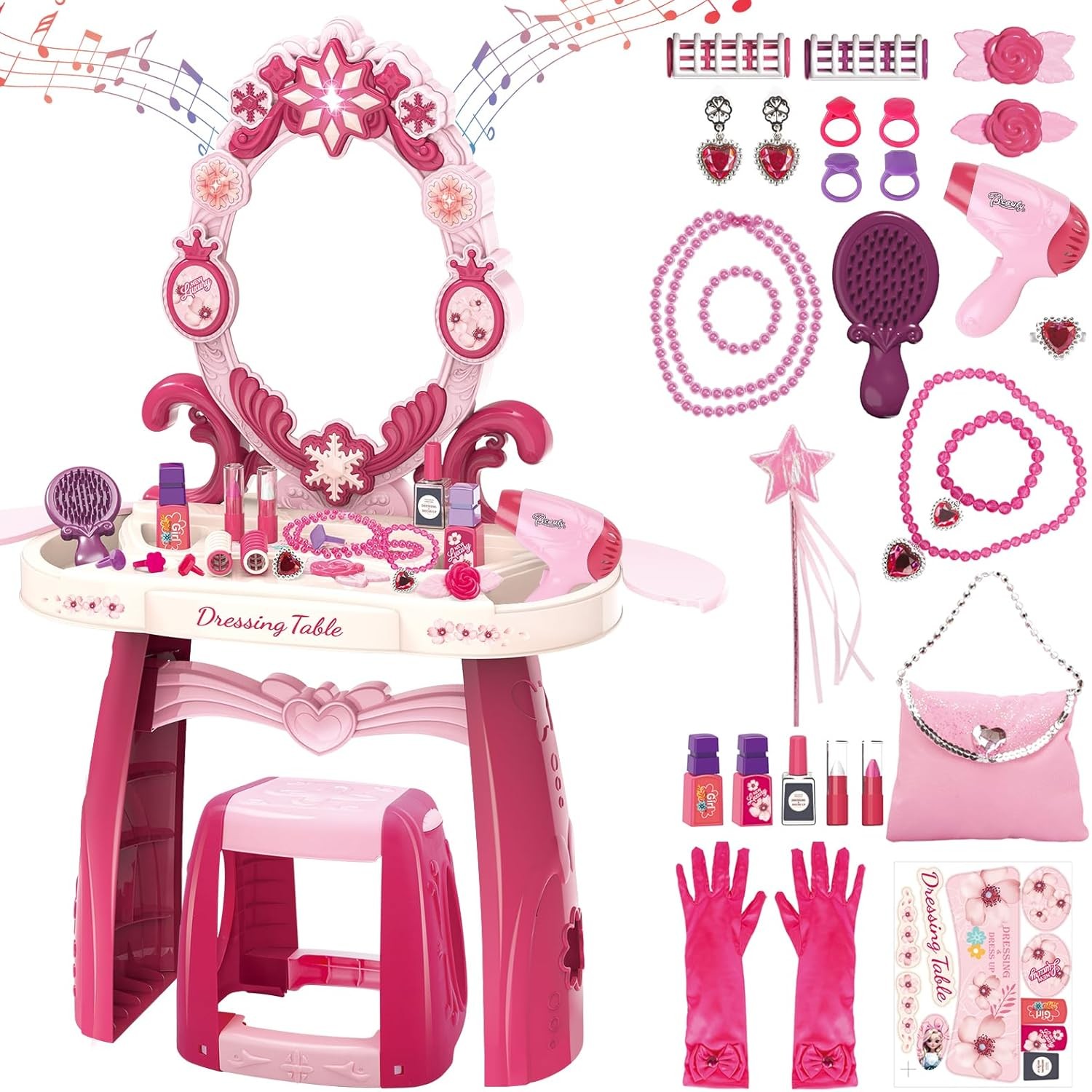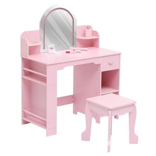 deAO Kids Vanity Table and Chair Set, Toddler Vanity with Light & Music, Shatterproof Mirror, Pretend Play Makeup, Grooming Accessories, Princess Beauty Salon Toy, Birthday Gift for Girls 3+(PINK)