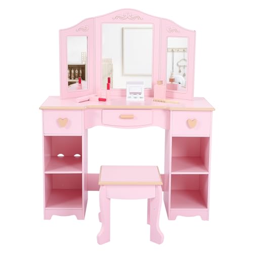 Kids Vanity Table and Chair, 2 in 1 Wooden Toddler Dressing Table with Tri-Folding Mirror, Storage Shelves, Makeup Pretend Play Toy for Girls (Pink)