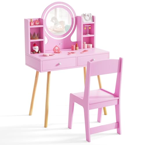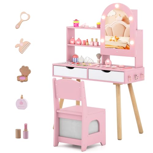 Aptliton Kids Vanity Table Set with LED Lights & Drawers, Wooden Princess Toddler Makeup Table with Chair & 3 Light Modes for Bedroom Playroom, Dressing Table, Pink