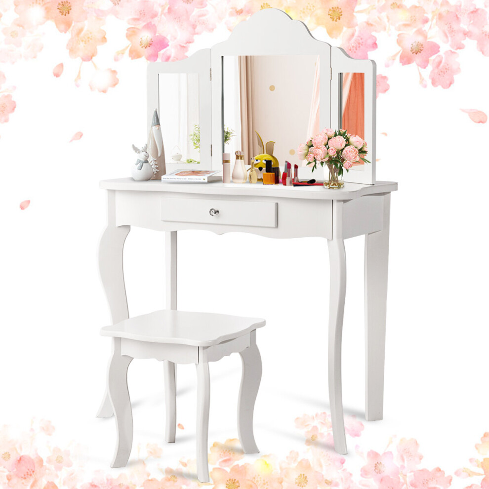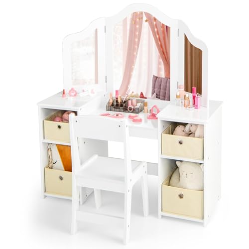 Kids Vanity Table and Chair, 2 in 1 Wooden Toddler Dressing Table with Tri-Folding Mirror, Storage Shelves, Makeup Pretend Play Toy for Girls (White)