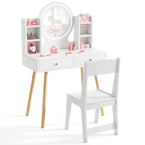 Aptliton Kids Vanity Table Set with LED Lights & Drawers, Wooden Princess Toddler Makeup Table with Chair & 3 Light Modes for Bedroom Playroom, Dressing Table, White