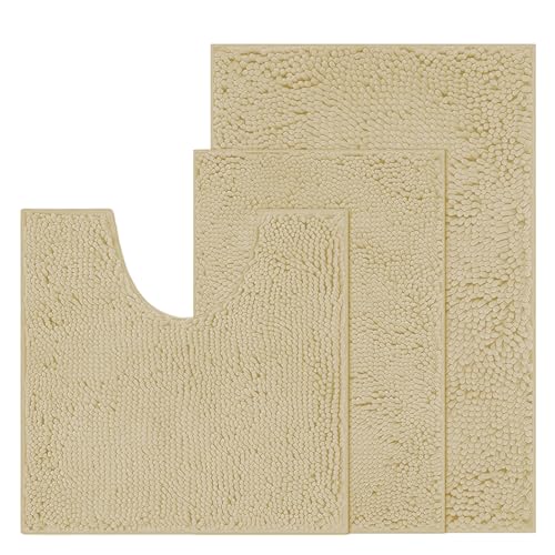 RUN HELIX Chenille Bath Mats Set, Soft Absorbent Chenille Bath Mats, Non-Slip Bath Rugs, U-Shaped Toilet Mats, Home Decor Accessories, Bath Mat Set for Bathroom, Beige