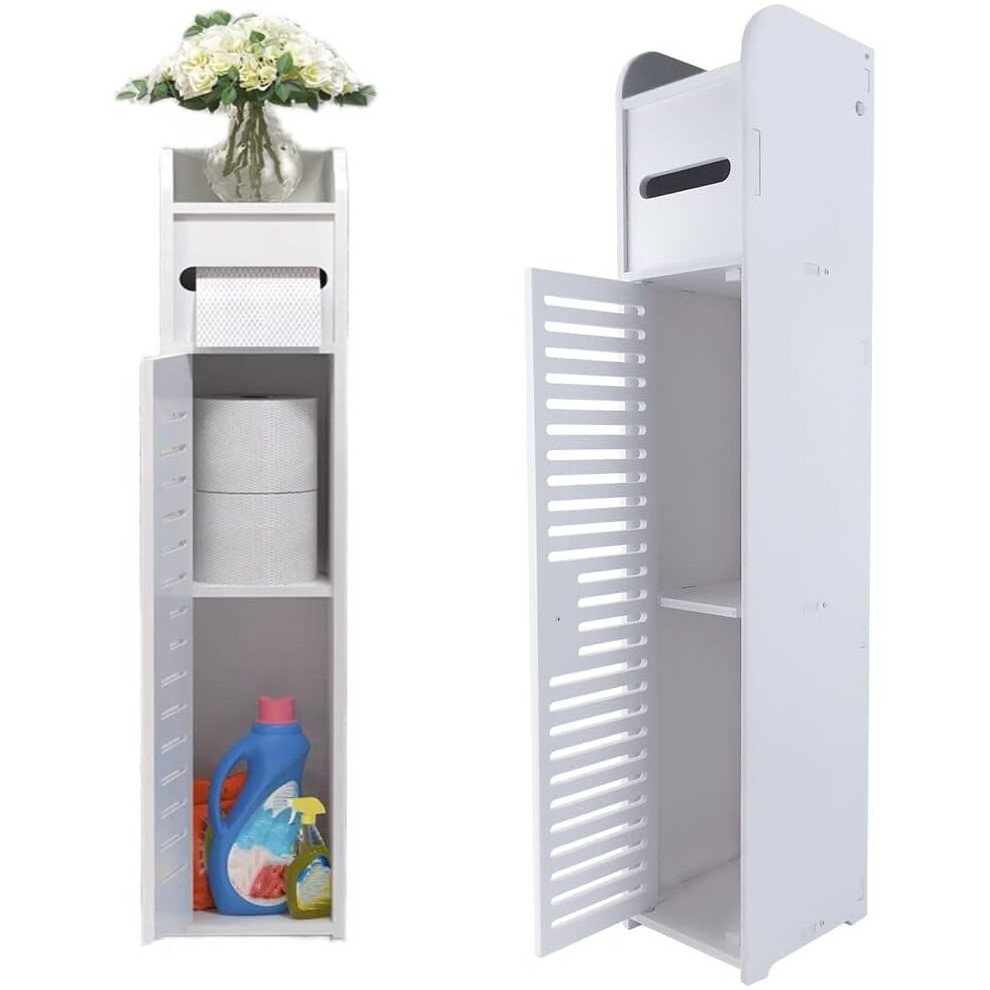 FENGSHENG-SHOP 4 Tier Bathroom Floor Cabinet, White Slim Bathroom Storage Cabinet with Toilet Paper Holder, Free Standing Shelf Unit with Door for Bathroom Living Room Kitchen Office,16x16x68CM