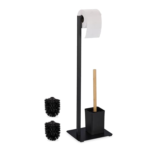 Relaxdays WC Set, Bamboo, Stainless Steel, Free-Standing, incl. 2 Spare Heads, Toilet Roll & Brush Holder, Black/Natural, 64.5 x 22 x 18 cm