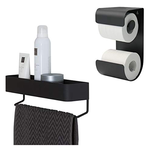 Sealskin Brix Toilet Roll Holder, Metal, Black, 11.6 x 25.5 x 12.5 cm + Sealskin Brix Wall Tray with Towel Rail, Metal, Black, 35 x 10 x 8 cm