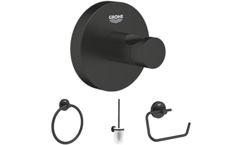 GROHE QuickFIx Bathroom Accessories 4 in 1 Set (Robe Hook, Towel Ring, Toilet Brush Set, Toilet Roll Holder Without Cover), Black Matt