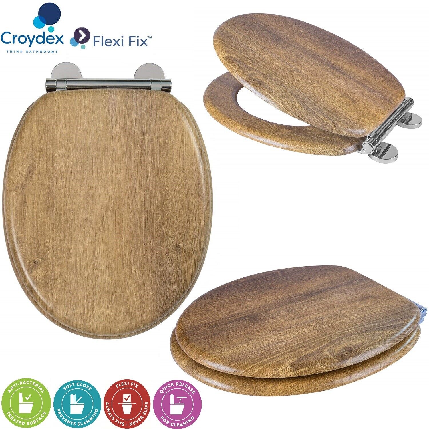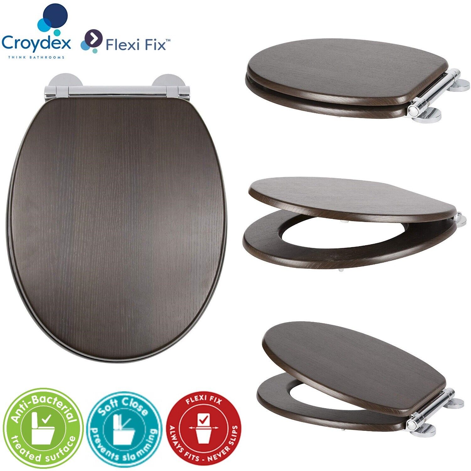 Croydex Ontario Soft Close Heavy Duty Toilet Seat Flexi-Fix Fittings - Teak