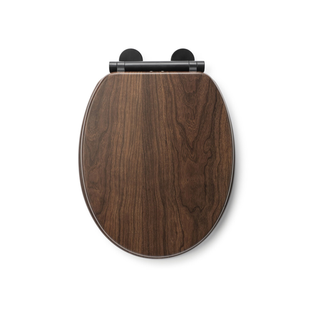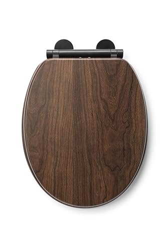 Croydex Soft Close Wooden Toilet Seat - Quick Release Button for Easy Cleaning and Adjustable Hinges with Top and Bottom Fixings Includes, Antibacterial Treated Surface (Walnut with Black Hinges)