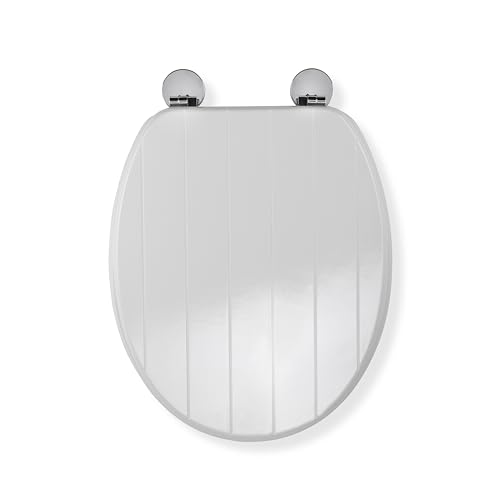 Croydex Como White Wooden Toilet Seat - Adjustable Hinges with Top & Bottom Fixings Included and Rust Free Chrome Plated Hinge Covers, Antibacterial Treated Surface (White Wood)