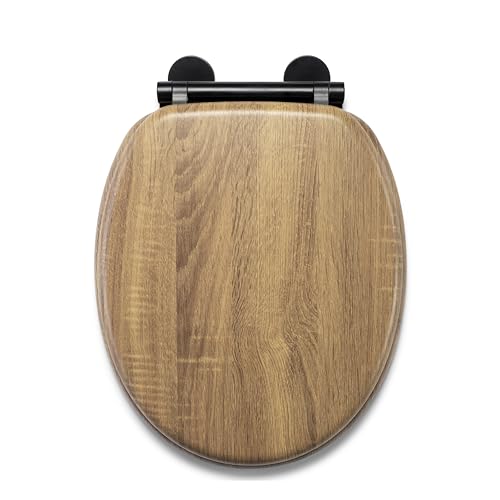 Croydex Ontario Soft Close Wooden Toilet Seat - Quick Release for Easy Cleaning and Adjustable Hinges with Top and Bottom Fixings, Antibacterial Seat Surface and Black Hinges (Teak Effect)