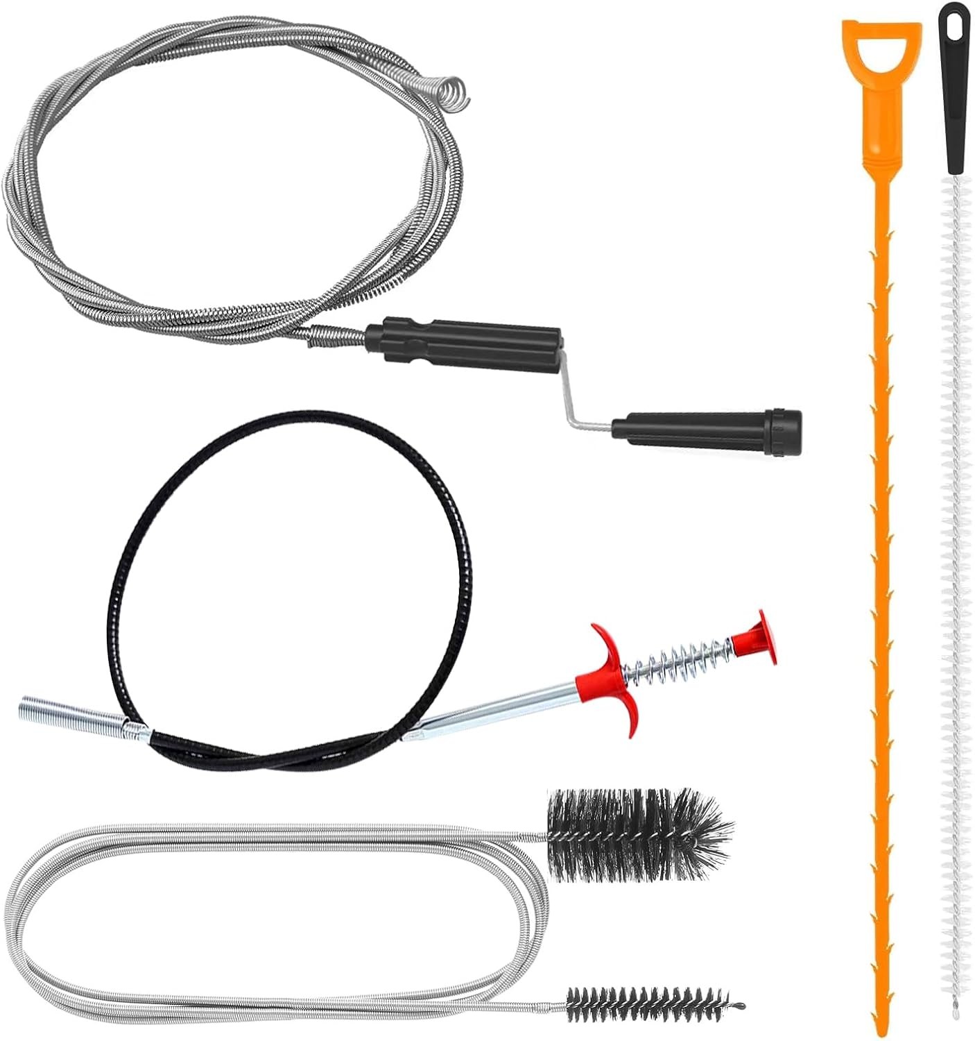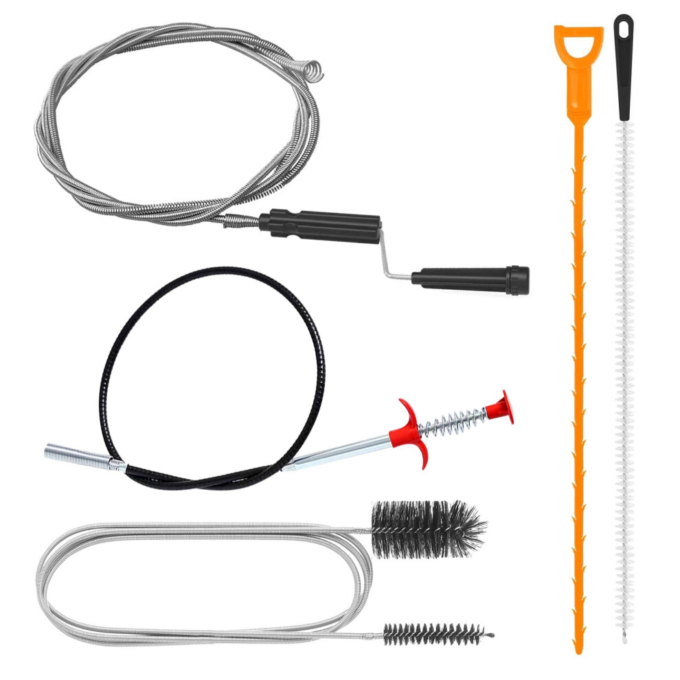 Drain Snake Toilet Unblocker Tool - 3M Sink Drain Plumbing Unblocker Wire, 50CM Drain Snake, 60CM Toilet Auger Hair Clog Remover with Claw, 70CM Sink Cleaning Brush, 6PCS (Orange)