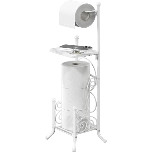 UIHECTA Free Standing Toilet Roll Holder, Bathroom Accessories Tissue Holder, Bathroom Toilet Paper Stand, for 3 Mega Rolls, Brush Set, Bathroom Organizer,White,With Phone Stand