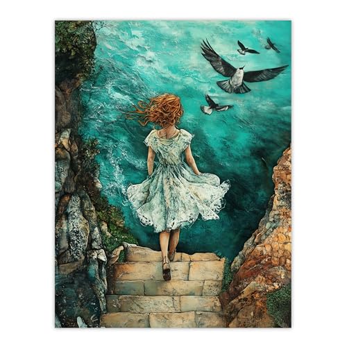 Artery8 Surreal Dream Dive Girl Stone Steps Sea Birds Bathroom Toilet Large Wall Art Poster Print Thick Paper 18X24 Inch