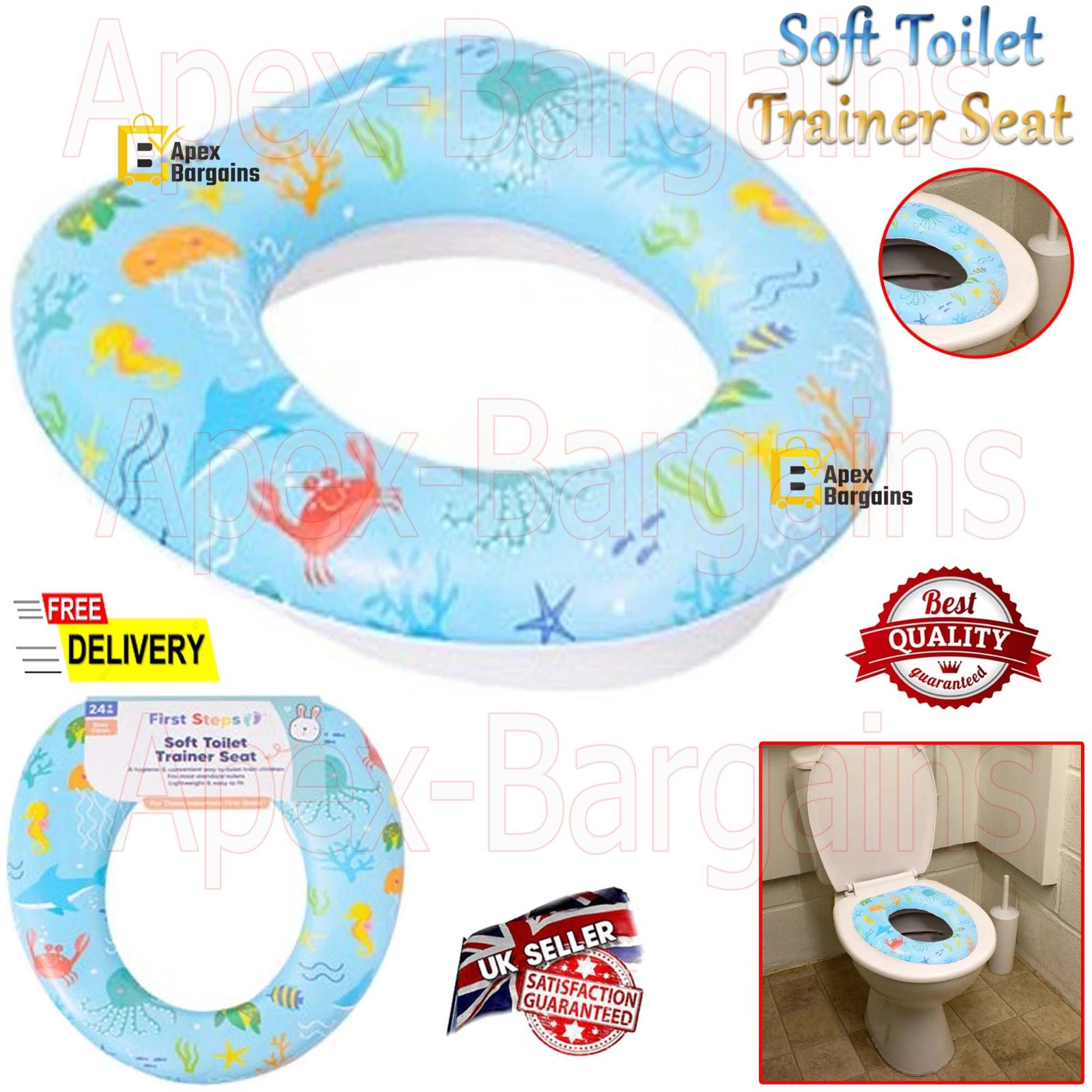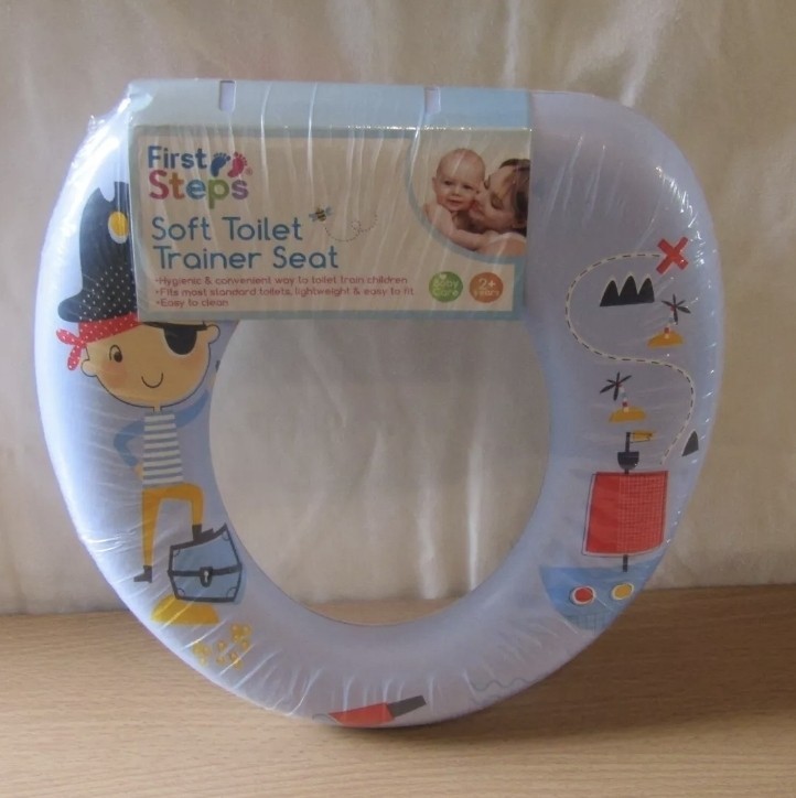 FIRST STEPS SOFT TOILET TRAINER SEAT IN BLUE WITH A PIRATE DESIGN.