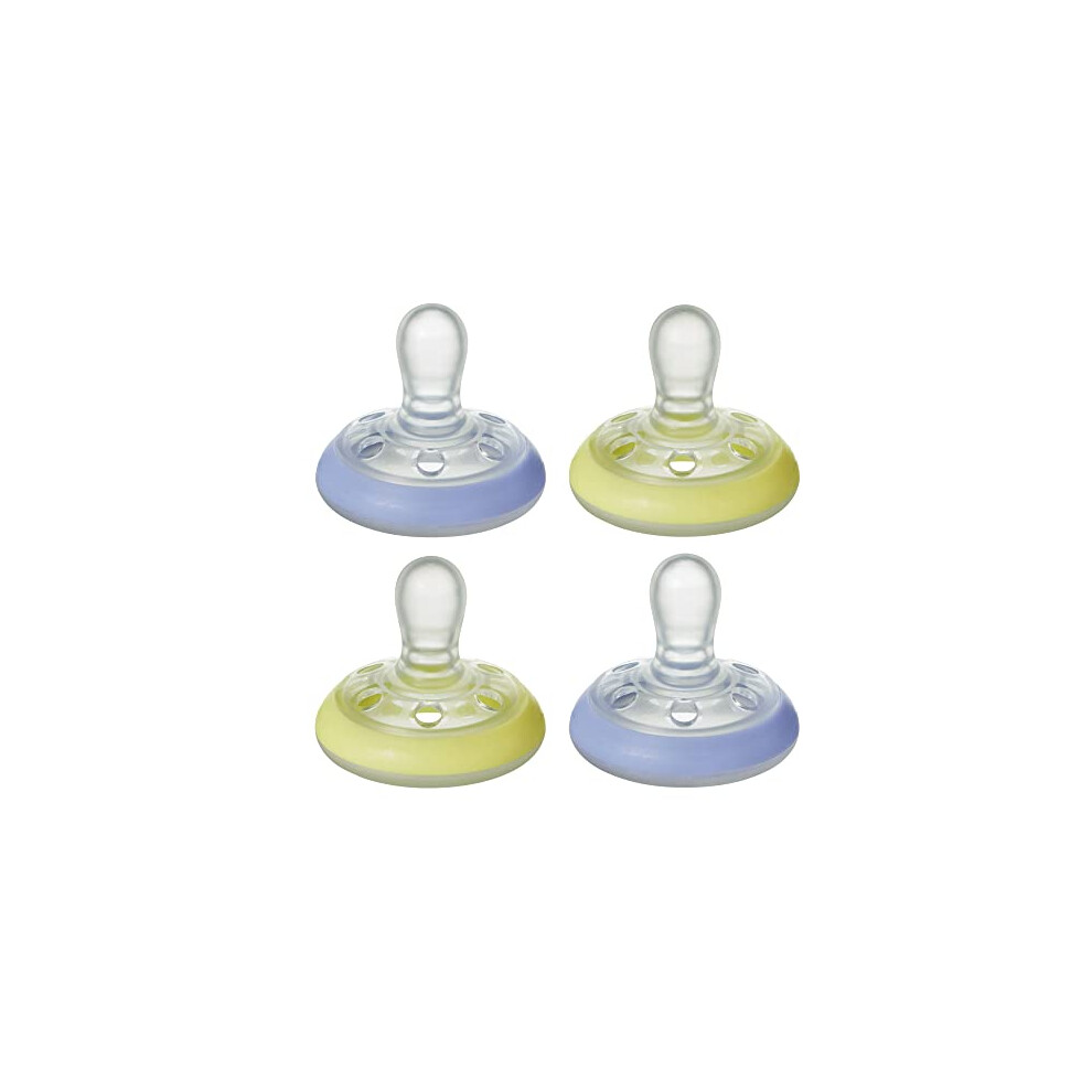 Tommee Tippee Breast-Like Soother Night, Glow in the Dark, Skin-Like Texture, Symmetrical Orthodontic Design, 0-6m, Blue and Yellow, Pack of 4 Dummies